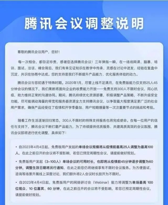 腾讯会议发布调整说明称,4 月 4 日起,逐步取消免费用户“ 300 人不限时会议”使用权限,单场会议最高人数和时长调整为 100人/60 分钟,相关升级功能移入会员体系。