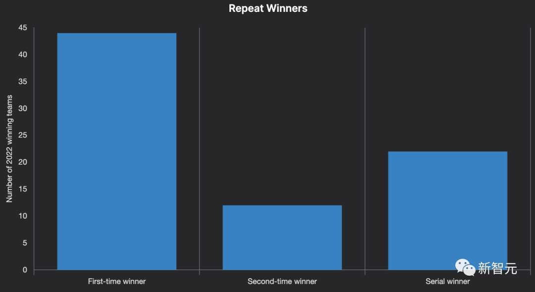 此外,有不到三分之一的获奖者是新参赛的选手,还有不到三分之一的是赢过不止一次比赛的团队。