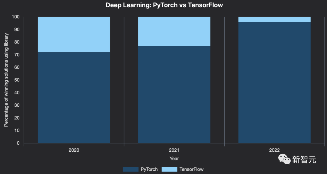 从2021年到2022年,PyTorch的增长非常显著:从77%上升到96%。