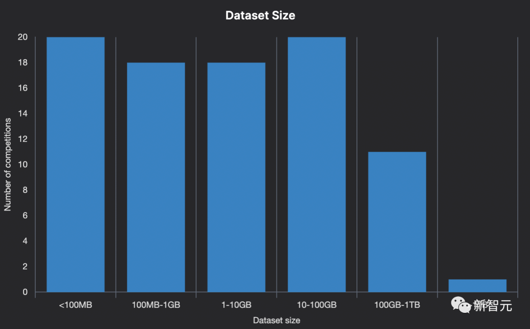 为比赛提供的数据量存在巨大差异,跨越了5个数量级。在低端,Kaggle的专利短语匹配竞赛只提供了超过2MB的数据,不过允许使用外部训练数据。