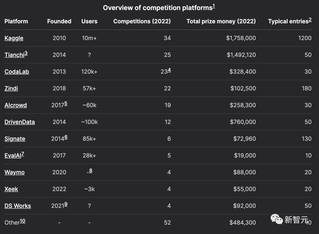 在「机器学习竞赛格局」中,报告简要回顾了竞赛情况和每个竞赛平台的活动,以及奖金和比赛类型。