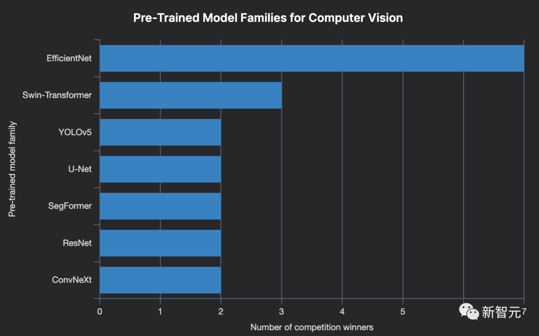 到目前为止,2022年获奖者中最受欢迎的预训练CV模型是EfficientNet。它的优势在于比许多其他模型的资源密集度低得多。