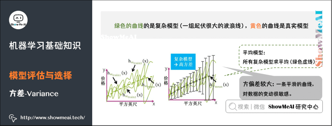 复杂模型的对应的函数千奇百怪,毫无任何规则,但平均模型的函数也是一条平滑的曲线,因此复杂模型的方差很大,并且对数据的变动很敏感。
