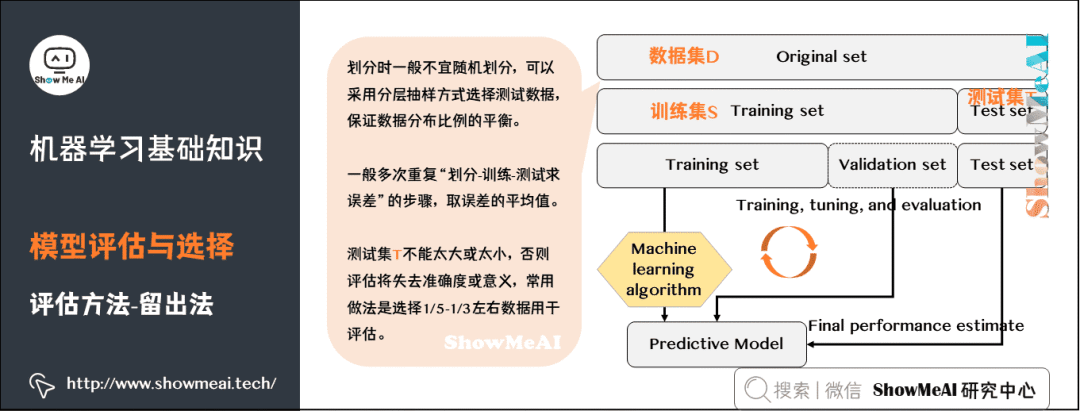 留出法(Hold-out)是机器学习中最常见的评估方法之一,它会从训练数据中保留出验证样本集,这部分数据不用于训练,而用于模型评估。