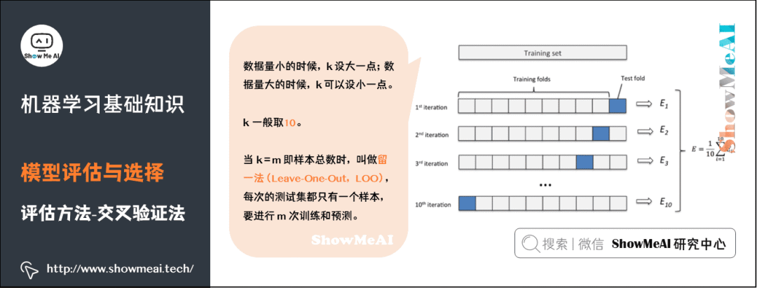 机器学习中,另外一种比较常见的评估方法是交叉验证法(Cross Validation)。k 折交叉验证对 k 个不同分组训练的结果进行平均来减少方差,因此模型的性能对数据的划分就不那么敏感,对数据的使用也会更充分,模型评估结果更加稳定。
