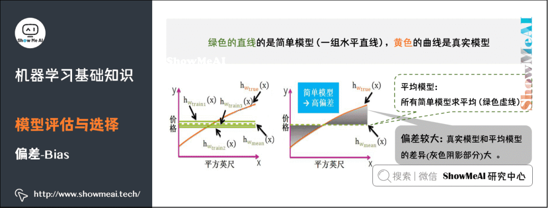 复杂模型是一组起伏很大波浪线,平均之后最大值和最小组都会相互抵消,和真实模型的曲线差别较小,因此复杂模型通常低偏差(见黄色曲线和绿色虚线几乎重合)。