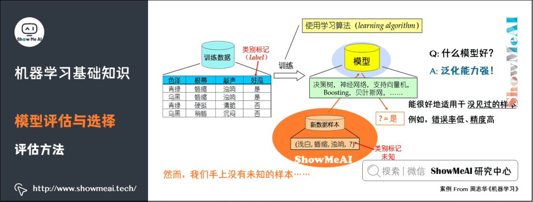 我们手上没有未知的样本,如何可靠地评估?关键是要获得可靠的「测试集数据」(Test Set),即测试集(用于评估)应该与训练集(用于模型学习)「互斥」。