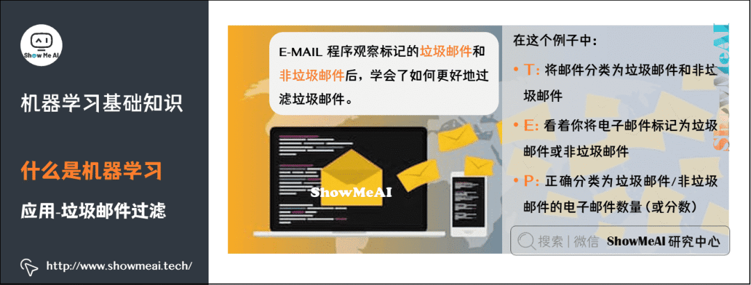 通过经典的 垃圾邮件过滤 应用,我们再来理解下机器学习的原理,以及定义中的T、E、P分别指代什么: