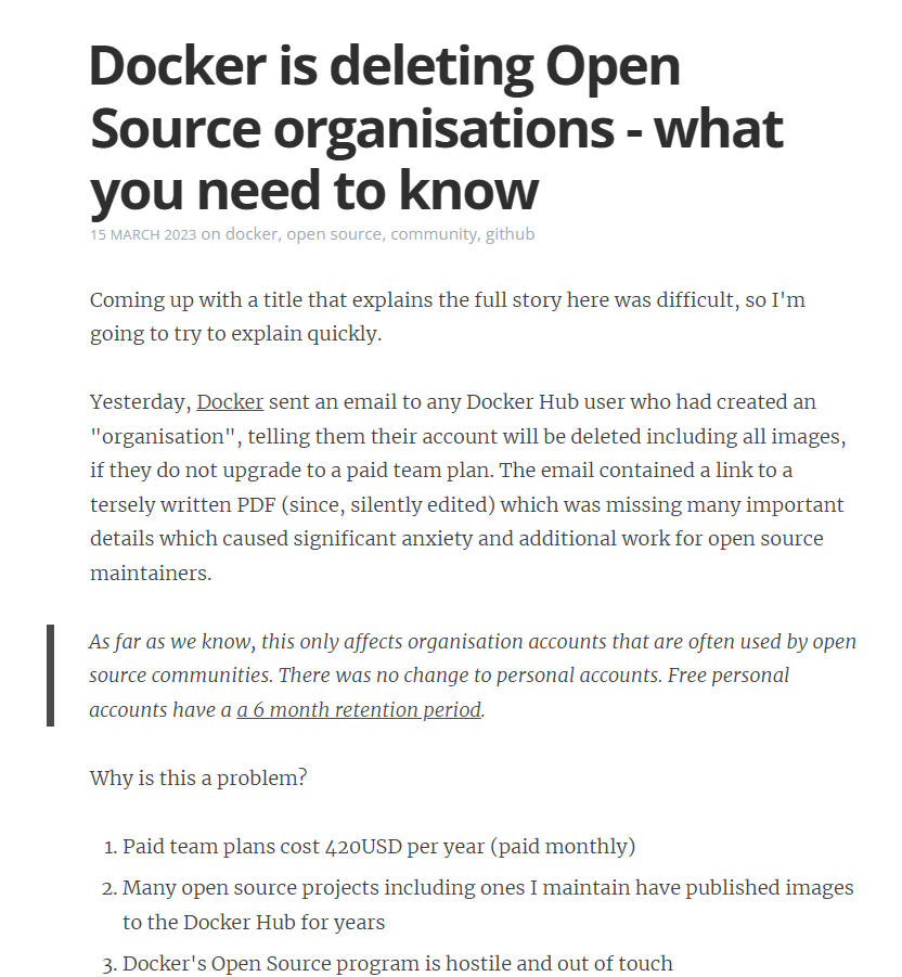 作为 Docker 的铁杆拥护者,“Docker Captains” 的忠实成员 Alex Ellis 在其博客发长文控诉 。本身就是付费用户的他并不反对 Docker 赚钱,但 Docker 的沟通方式和效果都糟糕透顶,给很多最忠诚、最支持他们的社区用户制造了焦虑,他们挟镜像以令开源的做法,暴露了他们对开源可持续问题的虚伪态度,这一项计划充满了敌意和脱节操作。