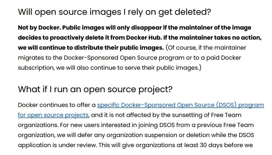 从“免费”到“付费”突然间的变化,给开源项目社区的用户带来了不少的恐慌与疑虑。对此,Docker 官方也提及了相关问题及应对措施。