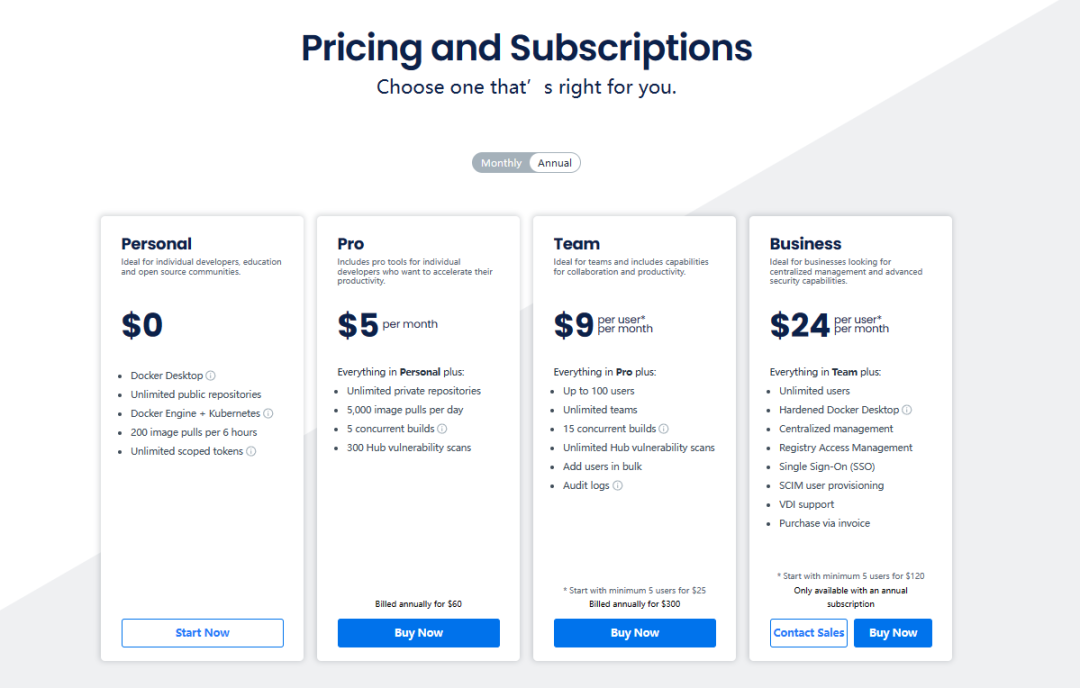 从官网信息来看,Docker 提供了三个付费订阅层。Docker 明确表示了三者的各自优势: