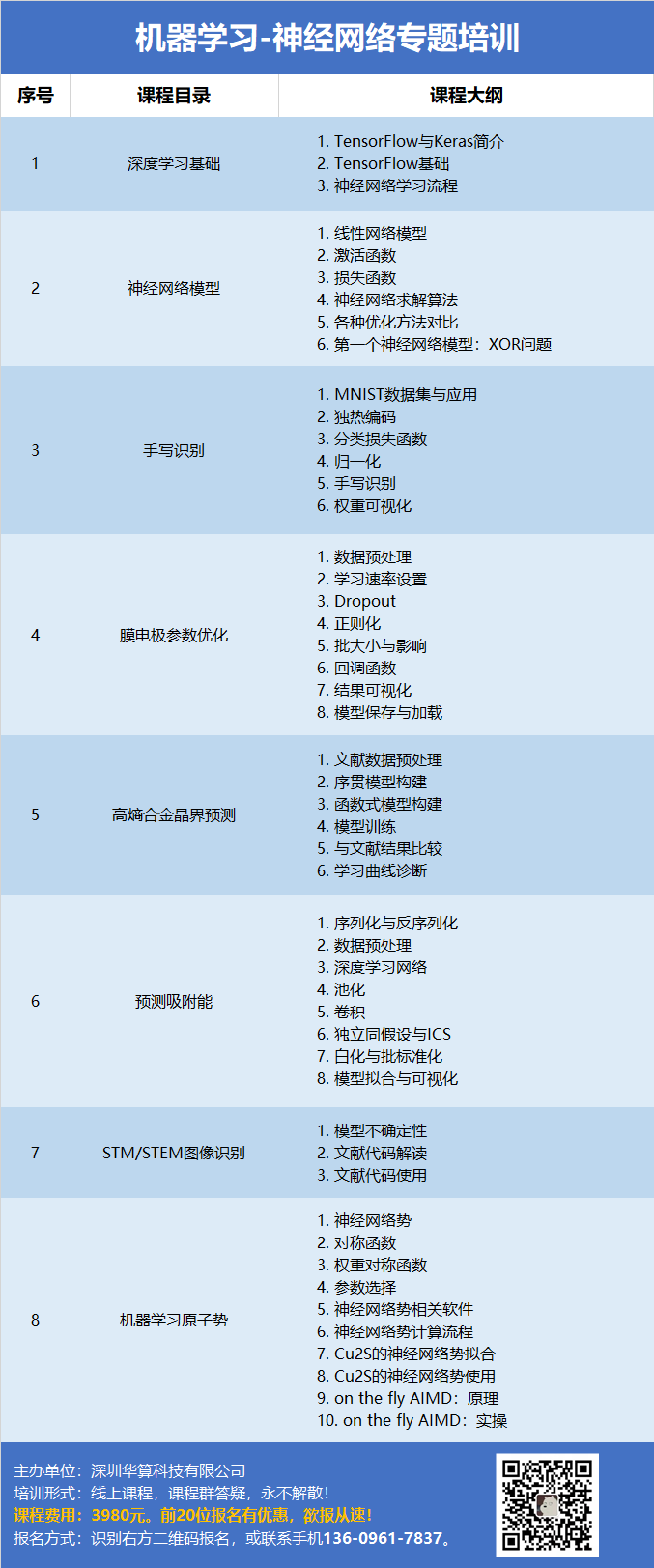 课程包括:机器学习概念,决策树/贝叶斯/支持向量机/神经网络/随机森林,回归/分类/聚类算法,模型评价/性能度量,小分子/MOF/d带中心/合金催化/单原子催化/钢铁强度/CO2RR/钙钛矿/电极涂层/STM图像,数据库/高通量筛选/Materials Project