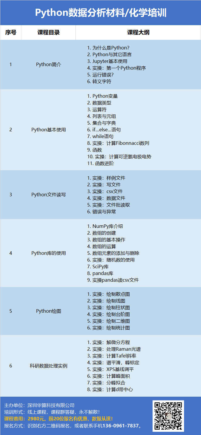 课程针对编程零基础学员,并包含实验与计算中常见的科研数据处理案例。同学们学习完成后可直接将Python应用于自己的研究数据后处理之中,适合有数据分析需求的实验课题组/计算课题组同学。