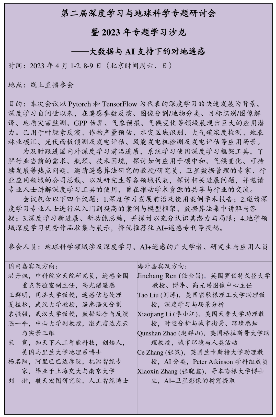 为及时跟进国内外深度学习前沿进展,并系统学习使用现有的深度学习框架工具以开展研究,了解行业当前的需求、瓶颈、技术困境,探讨如何应用于碳中和、气候变化、可持续发展等热点问题,由北京文雅信达科技举办、《遥感学报》与航天宏图信息技术股份有限公司等协办的第二届“深度学习与地球科学”专题研讨会与集中学习将于2023年4月1-2,8-9日举行,会期四天,本次会议邀请了遥感算法研究的教授/研究员、卫星数据管理的专家、行业应用领域的公司总裁、以及研究生等各领域代表,探讨相关进展问题,促进“产学研”一体化,并邀请专业人士讲解深度学习工具的使用,旨在推动学术资源的共享与行业的交流。