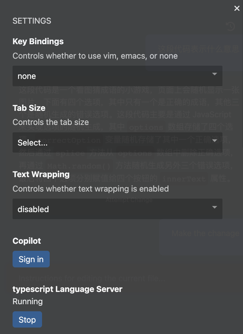 按下回车,Cursor 便会给我们生成一段可直接运行的 HTML 代码。有时候第一次生成的代码,可能不太好用,你可以连续输入同样的话,让它进行调整:最终打开 HTML 页面,预览结果如下所示:当然了,这里只是给大家展示下大概 Demo,所以随机图片与成语的关联性不强。有需要话,还可以进一步对代码进行调整,比如加入点击响应,编写获取图片脚本,让 AI 理解图片意思等等。如果你想询问 AI,关于某段代码的改进或调整建议,可以先选中代码,然后使用Ctrl/Command + L快捷命令调用机器人。接下来,就可以在聊天窗口中跟它进行一对一对话交流了。这个交互其实跟 ChatGPT 差不多,唯一区别较大的,就是 Cursor 提供了一个「Attempt Change」按钮,点击该按钮后可将变动直接应用到旧代码上。除此之外,Cursor 还内置了命令行终端,让项目具备更多操作方式。你还可以在设置中: