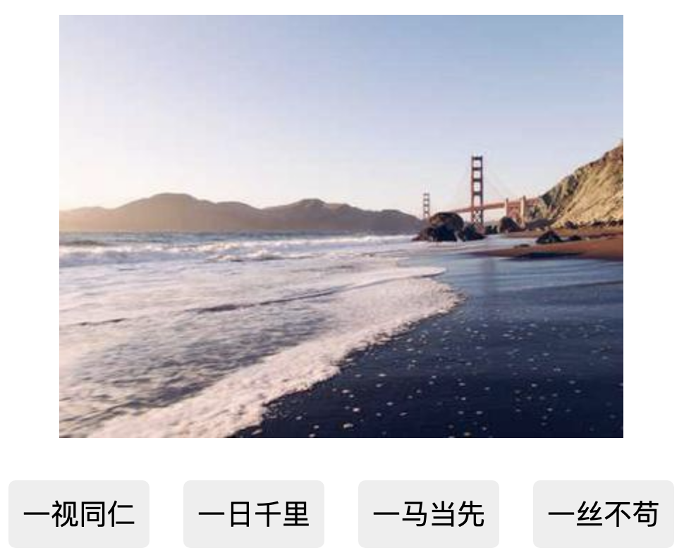 写一个「看图猜成语」的 HTML 页面。在该页面放置一张随机图片,图片链接可以从互联网上找。图片下方分别排列 4 个按钮,代表不同的四字成语选项,成语选项可以从互联网上找,但必须是随机的、不重复的。用户通过点击按钮,来判断哪个成语跟图片内容关联性最强。该 HTML 页面中展示的所有内容,都需要居中显示。