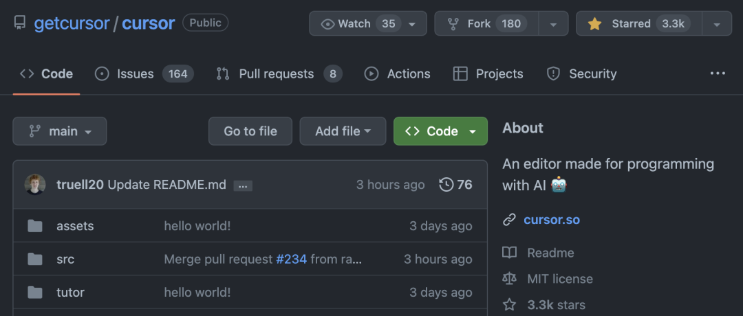 上周四,GitHub Copilot X 震撼发布,将一众老牌代码编辑器打得措手不及。但其实,Copilot X 不是第一个集成 GPT-4 模型的 AI 智能编程工具。在它发布的一两周前,一款名为 Cursor 的代码编辑器便已开始在技术圈内被疯狂传播。它主打一个亮点:通过 GPT-4 来辅助你编程,完成 AI 智能生成代码、修改 Bug、生成测试等操作。利用 GPT-4 强悍的编程能力,让 Cursor 成为第一个吃上螃蟹的代码工具。短短数日,它便收获了大量的开发者用户。同时,也有不少开发者通过它所内置的 Chat 功能,提前使用了 GPT-4。可惜的是,由于该编辑器完全免费开放,再加上 GitHub Copilot X 的发布,导致项目的运营成本越来越高。于是 Cursor 选择不再集成 GPT-4,也就是说,现在虽然 Cursor 还能用,但已经不基于 GPT-4 运行了。好消息是 Cursor 团队这两天已将代码开源到 GitHub 上了,有需求的开发者可自行定制。GitHub:https://github.com/getcursor/cursor开源后,Cursor 的 Star 数便增长迅猛。截止发稿,Cursor 已斩获了 3300+ GitHub Star,并成功登上 GitHub Trending。目前,项目仍属于早期阶段,能完成的功能,主要有以下这些: