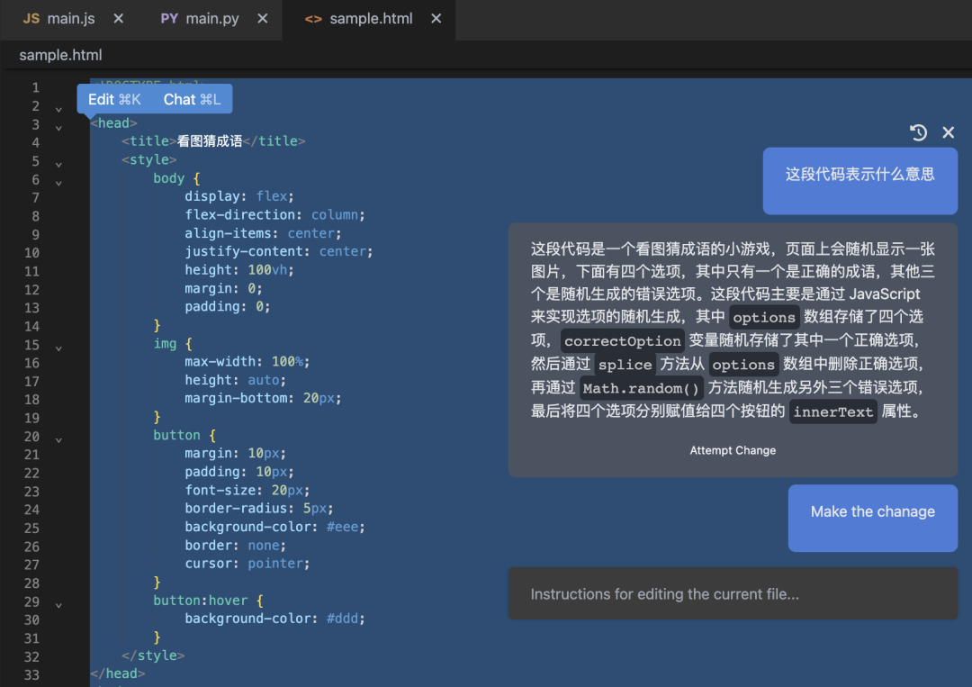 https://www.cursor.so/安装完成之后,打开 Cursor。你会看到如下所示的界面。想上手 Cursor,只需要搞懂两个快捷命令即可:Ctrl/Command + K:让 AI 生成或编辑一段代码。Ctrl/Command + L:与内置的 AI 交流,了解更多编程建议。比如,我想生成一个「看图猜成语」的 HTML 页面。只需要先创建一个 HTML 文件,然后用 Cursor 打开这个 HTML 文件,按下 Ctrl/Command + K,输入这段话: