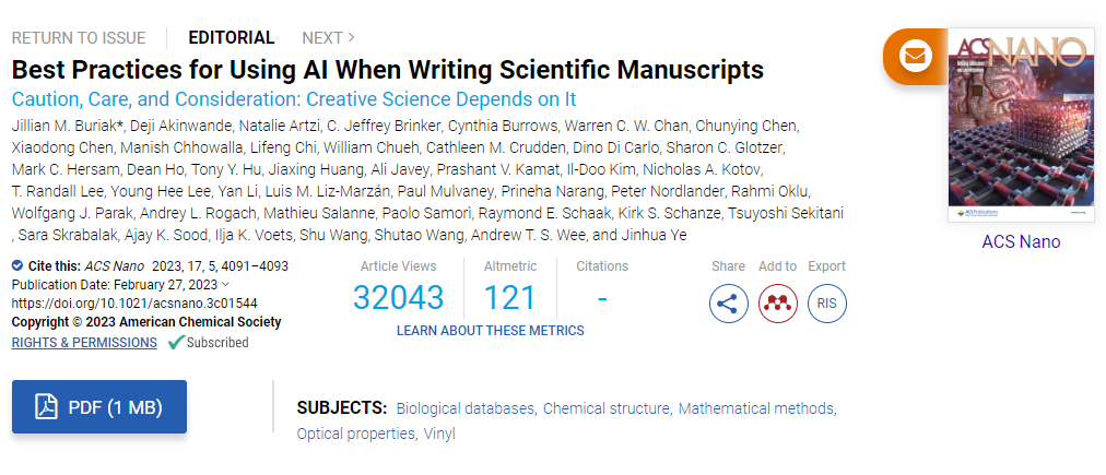 Jillian M. Buriak*, Deji Akinwande, Natalie Artzi, C. Jeffrey Brinker, Cynthia Burrows, Warren C. W. Chan, Chunying Chen, Xiaodong Chen, Manish Chhowalla, Lifeng Chi, William Chueh, Cathleen M. Crudden, Dino Di Carlo, Sharon C. Glotzer, Mark C. Hersam, Dean Ho, Tony Y. Hu, Jiaxing Huang, Ali Javey, Prashant V. Kamat, Il-Doo Kim, Nicholas A. Kotov, T. Randall Lee, Young Hee Lee, Yan Li, Luis M. Liz-Marzán, Paul Mulvaney, Prineha Narang, Peter Nordlander, Rahmi Oklu, Wolfgang J. Parak, Andrey L. Rogach, Mathieu Salanne, Paolo Samorì, Raymond E. Schaak, Kirk S. Schanze, Tsuyoshi Sekitani, Sara Skrabalak, Ajay K. Sood, Ilja K. Voets, Shu Wang, Shutao Wang, Andrew T. S. Wee, and Jinhua Ye