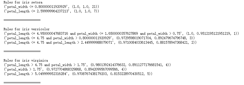 for idx, species in enumerate(dataset.target_names): X, y = dataset.data, dataset.target clf.fit(X, y == idx) rules = clf.rules_[0:3] print("Rules for iris", species) for rule in rules: print(rule) print() print(20*'=') print()