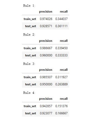 for i in range(4): print('Rule '+str(i+1)+':') display(compute_train_test_query_performances(X_train, y_train, X_test, y_test, skope_rules_clf.rules_[i][0]) )