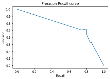 X, y = dataset.data, dataset.target > 25 X_train, y_train = X[:len(y)//2], y[:len(y)//2] X_test, y_test = X[len(y)//2:], y[len(y)//2:] clf.fit(X_train, y_train) y_score = clf.score_top_rules(X_test) # Get a risk score for each test example precision, recall, _ = precision_recall_curve(y_test, y_score) plt.plot(recall, precision) plt.xlabel('Recall') plt.ylabel('Precision') plt.title('Precision Recall curve') plt.show()
