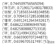 因此,可以通过对词向量之间的运算来推测词语之间的关系,例如:男人 - 女人 = 国王 - 王后。在这个例子中,通过对词向量进行加减法运算,推测出“女人”与“王后”之间的关系,即它们是同一类别的概念。我们看看我们的模型能不能得出类似的结果:1. result = model.wv.most_similar(positive=['肺炎','军团菌'], negative=['脑炎'], topn=10)2.for m in result:3.print(m)