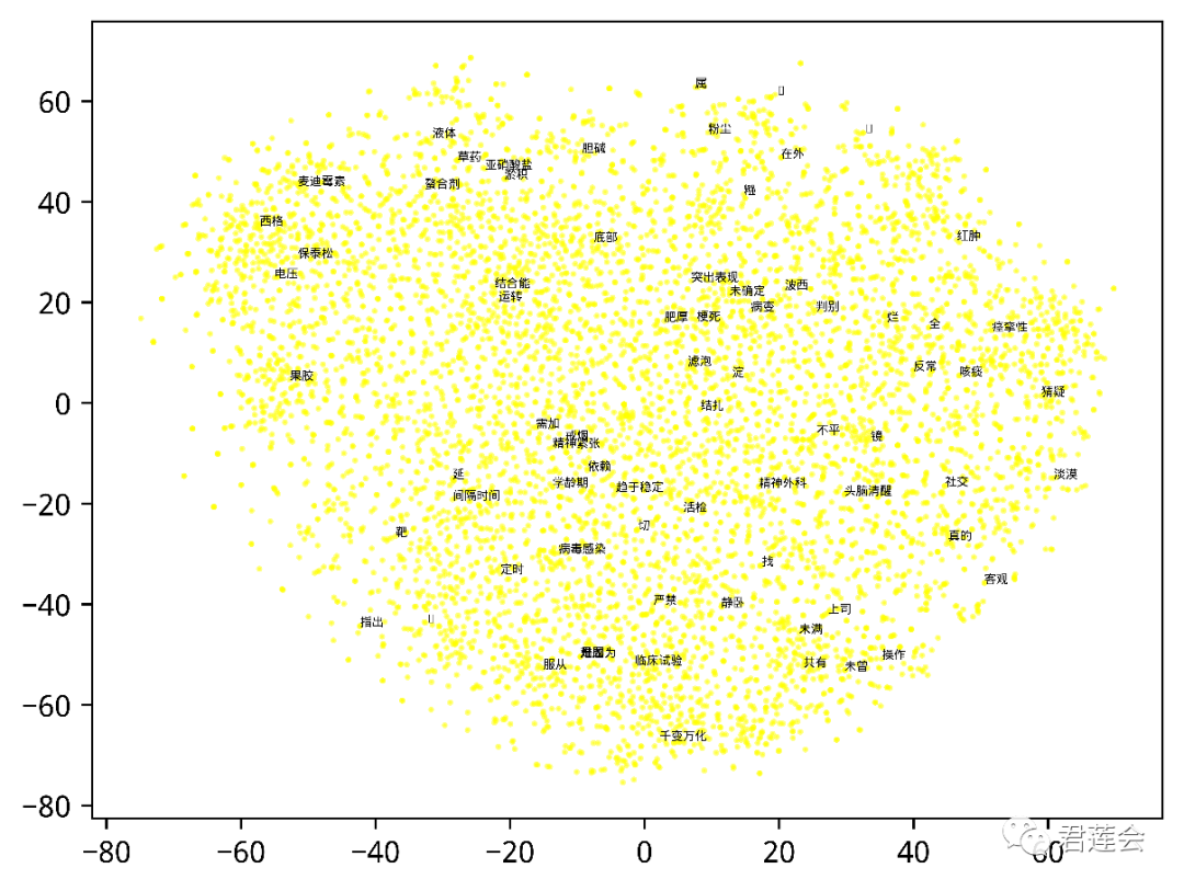 1.#-*- coding: utf-8 -*-2.import numpy as np3.import sklearn4.# pip install scikit-learn5.import matplotlib.pyplot as plt6.from sklearn.manifold import TSNE7.8.# 这个要找一个系统字体库有的字体9.# 如果和我一样用的linux系统10.# 可以用fc-list :lang=zh命令在terminal查找linux系统中有的字体11. mpl.rcParams['font.family']=['WenQuanYi Micro Hei']12.13.# 加载模型14. model = gensim.models.Word2Vec.load("my_word2vec_model.model")15.16.# 获取所有词向量17. X = model.wv.vectors18.19.# 使用t-SNE进行降维20. tsne = TSNE(n_components=2, random_state=0)21. X_tsne = tsne.fit_transform(X)22.23.# 可视化结果24. fig, ax = plt.subplots()25. ax.scatter(X_tsne[:,0], X_tsne[:,1], s=1, alpha=0.5, c='yellow')26.27.# 在图中显示每个词28.for i, word in enumerate(model.wv.index_to_key):29.if i %100==0:# 每100个词显示一次30. ax.annotate(word,(X_tsne[i,0], X_tsne[i,1]), fontsize=4)31.32.# 保存图像33. plt.savefig('word2vec.png', dpi=1200, bbox_inches='tight')34. plt.show() 我们可以观察图片上举例相近的中文词是否被聚类到一起:我们发现,‘肥胖’‘梗死’聚类在一起,‘戒烟’‘精神紧张’‘依赖’也同样被聚类。循环更多的词效果更显著一点,比如‘头孢他定’‘保泰松’‘布洛芬’就被聚类在一起,‘胃部’‘小肠’也被聚类在一起。虽然效果不是特别好,不过仔细观察一下还是蛮好玩的。好啦,今天的分享就到这里了。大家有空的话也可以换本书复制复制代码玩一下。在这个AI兴盛的大时代,作为医生我们也能用感兴趣的方式去体验自然语言模型,还是蛮有趣的!同时,也可以将自然语言处理基础应用于医学研究领域,挖掘和分析大量的医学文本数据,可以助力科研以及简化平时的工作。