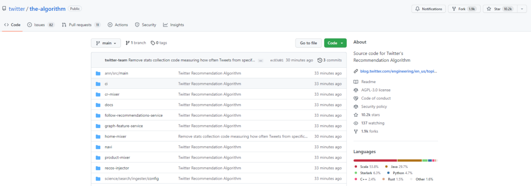 3 月 31 日,正如马斯克一再承诺的那样,Twitter 已将其部分源代码正式开源,其中包括在用户时间线中推荐推文的算法。目前,该项目在 GitHub 已收获 10k+ 个 Star。