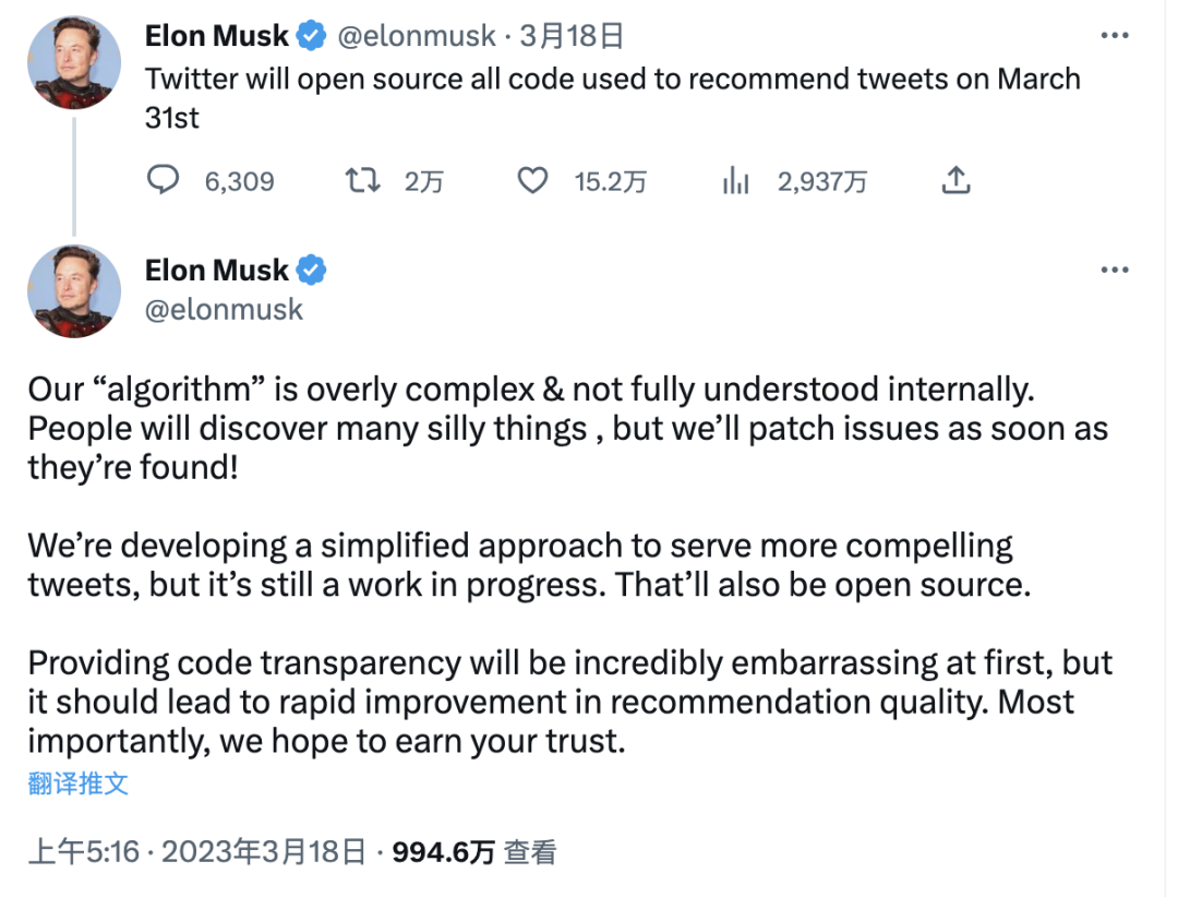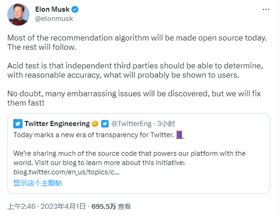 2023 年 2 月 21 日,马斯克称将于下周对 Twitter 算法进行开源。当时一位 Twitter 用户表示,如果 Twitter 能够开源算法,他们将会“真心折服”。马斯克回应道:“当我们下周开源算法时,一开始请做好失望的准备,但之后将会快速改善。”
