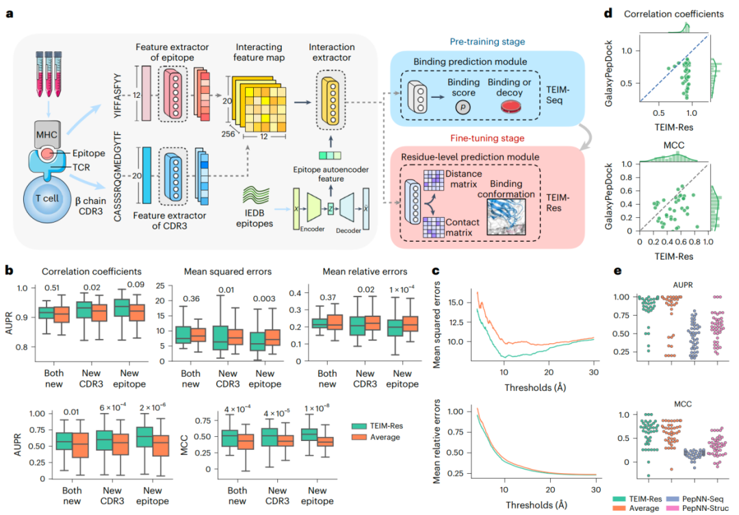 T细胞受体和抗原表位的相互作用是启动机体免疫的重要环节,这种相互作用可以激活T细胞,从而识别并攻击感染机体的病原体,例如细菌、病毒或肿瘤细胞。当T细胞受体和特定抗原表位结合时,会激活一系列信号传递通路,从而促使T细胞增殖并释放各种细胞因子。因此,研究T细胞受体和抗原表位的相互作用以及两者的关键结合位点是理解机体免疫系统如何工作的关键。2023年3月27日,清华大学交叉信息研究院的曾坚阳/赵诞研究组在Nature Machine Intelligence发表文章Characterizing the interaction conformation between T cell receptors and epitopes with deep learning,成功开发了能预测T细胞受体和抗原表位相互作用的深度学习模型,通过建模和预测T细胞受体和抗原表位的相互作用以及氨基酸层面的关键互作位点,为揭示T细胞受体和抗原表位的结合规律和机制提供了有效工具。除此之外,作者还展示了模型的三种潜在应用:捕捉和预测突变引起的TCR-epitope相互作用的构象变化,对特定抗原表位的TCR组库计算关键结合位点,以及挖掘TCR-epitope相互作用的潜在规律。T细胞在适应性免疫反应中对抗原表位的识别至关重要。这种识别通过主要组织相容性复合体(MHC)呈递的致病抗原(epitope)与T细胞受体(TCR)相互作用来实现,随后刺激细胞介导的免疫反应,进而消除被感染细胞并激活相应的免疫反应。因此,深入了解TCR-epitope的结合机制对于癌症免疫学、自身免疫抗原发现和疫苗设计具有重要意义。然而,由于这种识别机制的内在复杂性,TCR与epitope的相互作用往往依赖实验,如表面等离子共振(SPR)、酶联免疫吸附(ELISA)、细胞荧光免疫分析(IFA)或细胞流式分析等方法进行检测和验证,通常既费时又昂贵。为了解决这一问题,来自清华大学交叉信息研究院的曾坚阳/赵诞团队开发了TEIM模型,通过小样本学习(Few-shot learning)的思想来准确预测TCR-epitope在氨基酸水平的相互作用和结合信息。模型首先在粗粒度的TCR-epitope序列结合信息上进行预训练,然后在细粒度的残基相互作用信息上进行进一步微调。其基本的设计思想是,TCR与表位的整体相互作用是由所有氨基酸的相互作用共同决定的,因此作者借助卷积神经网络的卷积核的特性,利用体外结合实验提供的结合信息帮助预测两者在氨基酸层面上的相互作用。测试和分析结果表明,TEIM模型具有优良的预测性能,准确度超过现有其他方法。随后,作者在三个具体的应用场景中展示了模型的效果。首先,作者将模型应用在突变序列上,从而预测出TCR或表位序列上的突变对两者结合的影响;其次,作者利用模型分析特定表位的TCR库,从而获得结合该表位的特征模式;最后,作者通过预测模型揭示了TCR和抗原表位互作面上的一些常见的规律模式和结合机制。该研究首次使用深度学习框架建模多层级的T细胞受体和抗原表位的相互作用,并且融合了大规模预训练思想和少样本学习策略,为阐明T细胞识别抗原表位这一重要的生命科学问题提供了有力工具。图1. TEIM模型结构和评估效果 (a) TEIM-Seq 和 TEIM-Res 的模型结构以及训练流程。(b-e) TEIM-Res 和其它基线方法相比。