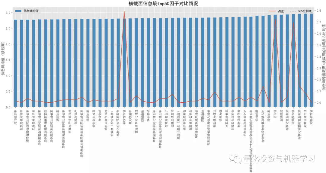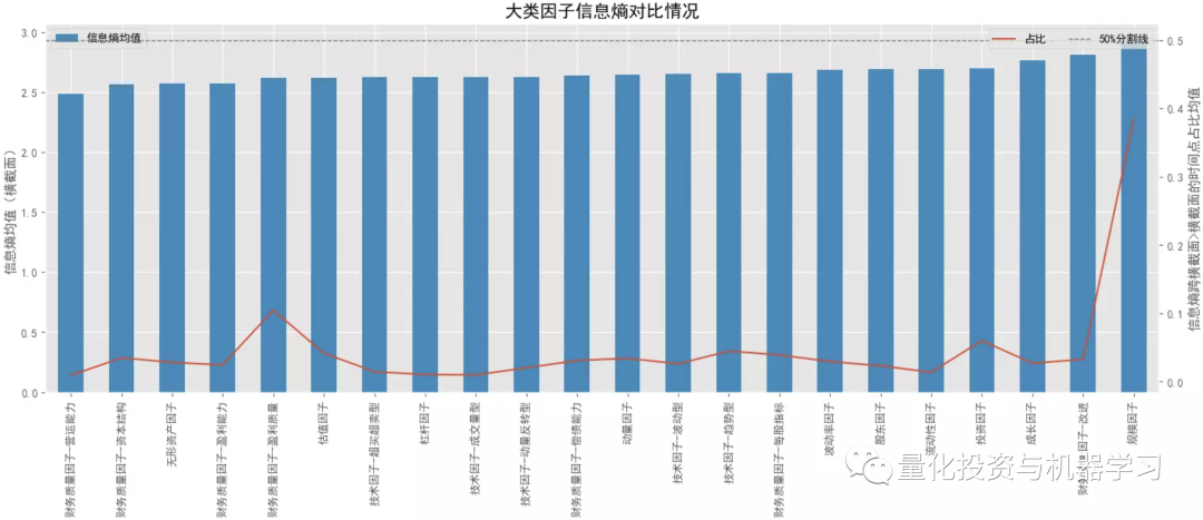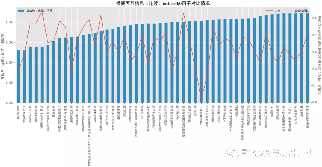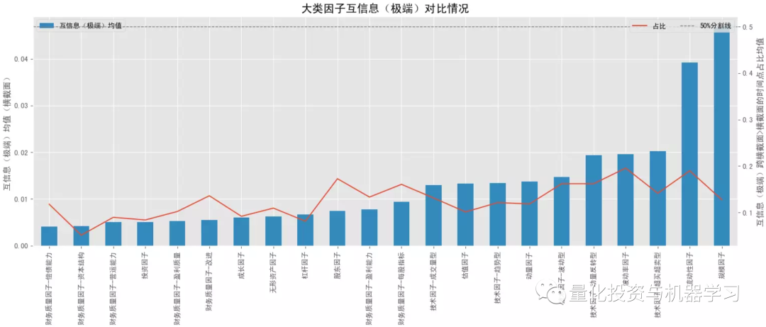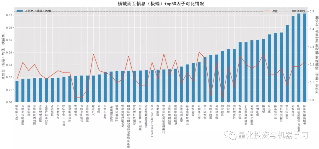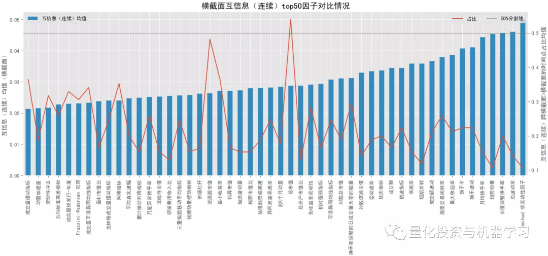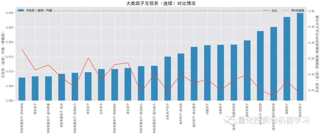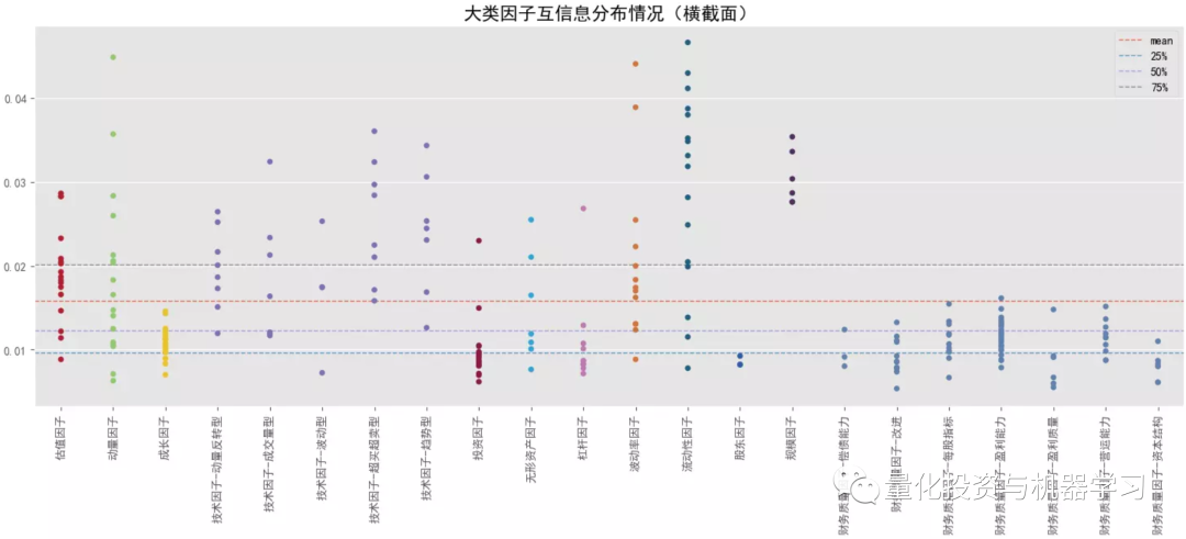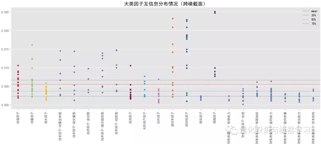 互信息是从信息熵的角度考察变量间的关系,即收益 y 在给定因子 x 信息的情况下减少的不确定性,互信息越高,因子 x 带来的关于收益 y 的信息越多,越有助于减少收益 y 的不确定性,收益 y 对因子 x 的依赖程性也越高,也能捕捉变量间的非线性关系。决策树中用于判断分支节点的信息增益(公式2)本质上和互信息(公式1)是一致的。sklearn 在特征选择模块中提供了 2 中计算互信息的方法,mutual_info_classif (即mutual_info_score)适用于离散目标变量,mutual_info_regression 适用于连续目标变量。 下图测试结果调用 mutual_info_regression 计算互信息,大类因子中,互信息排名靠前的有:流动性因子>规模因子>来自量价的技术因子、波动率因子、动量因子等,也是量价因子表现优于基本面因子,跨横截面后互信息也都有所降低,整体上与卡方检验的结果较为一致。结合下面几幅图可知各大类因子中互信息排名最靠前和排名最靠后的具体因子以及它们在分布图中的大致位置(最顶端的点和最底端的点)。排名靠前因子中,量价因子居多,比如 Amihud 非流动性因子、总波动率因子、各类换手率因子等;排名靠后因子中,基本面因子居多,如各类财务质量因子。 下图测试结果调用 mutual_info_score 计算互信息,在测试前对因子和收益做了离散化操作(因子 x 离散化采用方式 ②,阈值取0.1,收益 y 离散化采用方式 ①,阈值取 3),重点评价极端值的表现。大类因子排序有些许变化,但整体上也是呈现“量价因子表现优于基本面因子,跨横截面后互信息也都有所降低”的规律。对比连续值下的互信息,极端值下互信息头尾差异较大,规模因子、流动性因子极端值的作用比基本面因子高很多。 极端值下,互信息最高的是市值调整的换手率,其次是 Amihud 非流动性因子,然后是一些规模因子,规模因子极端值的作用整体上要强于流动性因子。