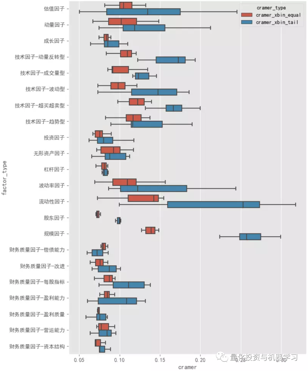 下图还进一步对比了因子 x 的 2 种离散化方式下大类因子 Cramer'V 均值分布情况(因子 x 采用 3 等均分 equal 和保留 10% 的尾部 tail,收益 y 同上,采用 3 等均分),极端值下因子与收益的关联关系相对更高,这个现象在财务质量因子上的表现相对要弱些。