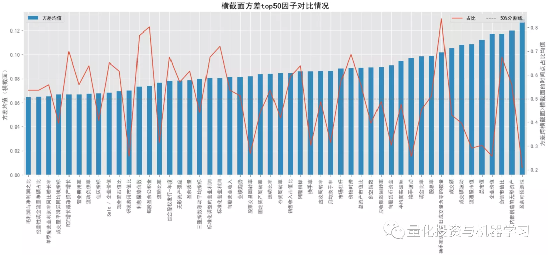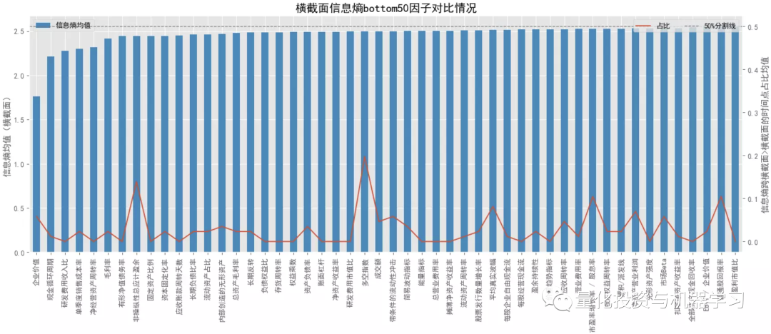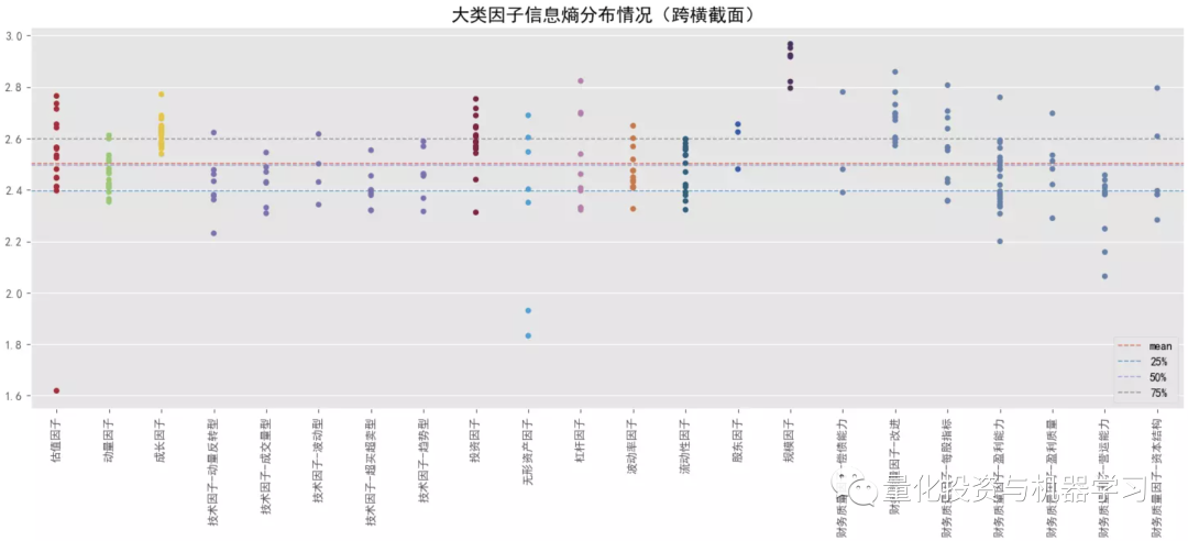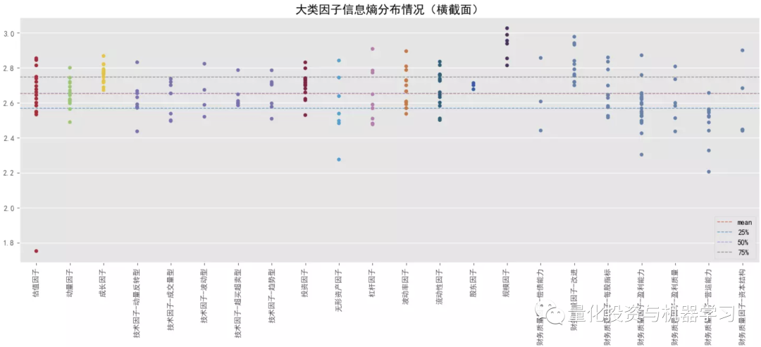 ▪ 因子预处理:MAD 异常值处理、行业中位数缺失值填充、市值行业中心化处理、标准化处理;前 3 步处理都在横截面上操作,第 4 步标准化处理可进行横截面或跨横截面操作;▪ 测试频率:月频,特征为因子值,标签为股票下个月收益率;▪ 有 2 种滚动测试的样本划分:① 横截面测试:以每个月末 t 横截面对应的行数据为样本,进行滚动测试;② 跨横截面测试:模拟模型滚动训练时时间窗的划分,在每个月末 t ,回溯过去 24 个月(包含当前月),以这个时间区间上的行数据为样本,进行滚动测试;▪ 因子预处理:提前剔除了缺失率高的因子,最终参与测试的因子数为 232 个。 非监督型评价指标只计算单个因子 x 自身的统计指标来用于因子筛选,不涉及标签 y 的信息,是对因子自身情况的评价,常用的统计指标有:缺失率、方差、信息熵等,下文重点介绍方差、信息熵。 方差衡量了变量的离散程度。如果某个因子的方差很小,说明该因子在所有样本上的取值都趋于相同,对样本没有区分度,对模型来说用处不大。计算方差时,因子预处理不做标准化处理,但会做归一化处理。 对比大类因子的平均方差情况,排名靠前的有估值因子>无形资产因子>规模因子>流动性因子,而且这些类因子(特别是规模因子)跨横截面后方差有些许降低(因子取值波动反而变小了);常用的动量因子的方差排名相对靠后;波动型技术指标的方差受时间维度的影响较大,跨横截面后该类因子取值波动变得更大了。结合下面几幅图可知各大类因子中方差排名最靠前和排名最靠后的具体因子以及它们在分布图中的大致位置(最顶端的点和最底端的点),所有因子过去所有横截面的平均方差都在 0.025 以上。 信息熵衡量了变量所包含的平均信息量。可以用信息熵来衡量因子取值的混乱程度(反过来说是“纯度”),如果某个因子的信息熵很高,说明该因子取值相对混乱和丰富,不确定性高,而不是偏向于单一取值,能为模型提供的信息也多。在计算单个因子的信息熵时,先将因子按取值范围的 10% 分位间隔进行离散化处理,分为 10 组,各组内的频数不等,再基于如下公式计算信息熵,其中p(xi)为各组内的频率:对比大类因子的平均信息熵情况,排名靠前的有规模因子>财务质量因子-改进>成长因子>投资因子>流动性因子等,但各大类因子间的信息熵差距并不是很大。值得注意的是,所有大类因子的信息熵在跨横截面后都有所下降(占比小于0.5)。结合下面几幅图可知各大类因子中信息熵排名最靠前和排名最靠后的具体因子以及它们在分布图中的大致位置(最顶端的点和最底端的点)。当所有组内频数都一致,即p(xi)=0.1时,信息熵达到最大,取值约为 3.32,对数市值、营业利润相关因子的取值都接近该水平。