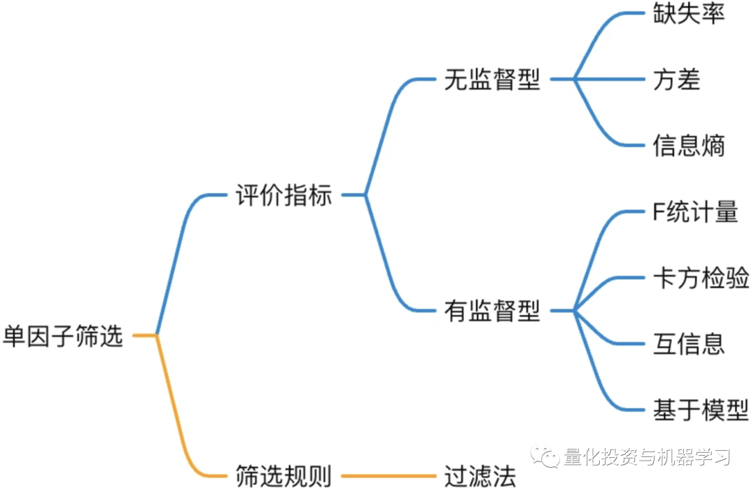 在传统的多因子模型体系下,已经有一套相对成熟的因子检验和因子筛选流程,因子检验大多涉及因子的 IC 分析、收益率分析、换手率分析、板块分析等多个方面,是对单个因子做检验,判断其是否对收益有显著影响;因子筛选主要有逐步回归、主成分分析 PCA 等方法,是对批量因子做筛选,剔除冗余因子,降低因子间的相关性,因子检验得到的因子有效性程度也可以作为因子筛选的评价指标,用于剔除低效因子。而本文主要是站在机器学习视角介绍相关的因子筛选方法,即特征筛选方法,机器学习下的因子筛选主要是为了模型能有更好的预测效果、更强的泛化能力,其中也会涉及相应的评价指标和筛选规则,但指标和规则不再局限于简单的线性相关性和线性回归,也涵盖了很多非线性关系的考察。 在机器学习视角下,根据是否考虑因子间的冗余信息 redundancy 或是多重共线性的影响 substitution effects,可以将因子筛选分为单因子筛选和多因子筛选,单因子筛选通常是对单个因子做独立评价,然后再基于筛选规则选出排名靠前的部分因子,选出的因子集可能存在冗余信息;多因子筛选通常是逐个比较新因子在已选因子基础上带来的“增强”作用来决定该因子的去留,选出的因子集是对收益有最强解释力且因子间不相关的因子,传统的因子筛选多属于这类。 下文先重点介绍单因子筛选常用的评价指标,了解因子日历中的因子在这些评价指标上的排名情况,单因子筛选的筛选规则通常选的过滤法,即筛选出排名靠前的部分因子,本文就不再赘述。选用的评价指标有:方差、信息熵、F统计量、卡方检验、互信息,其中前两个指标在计算时不考虑收益 y 的信息,可称为非监督型评价指标,其余指标在计算时同时考虑了收益 y 的信息,可称为监督型评价指标。测试说明