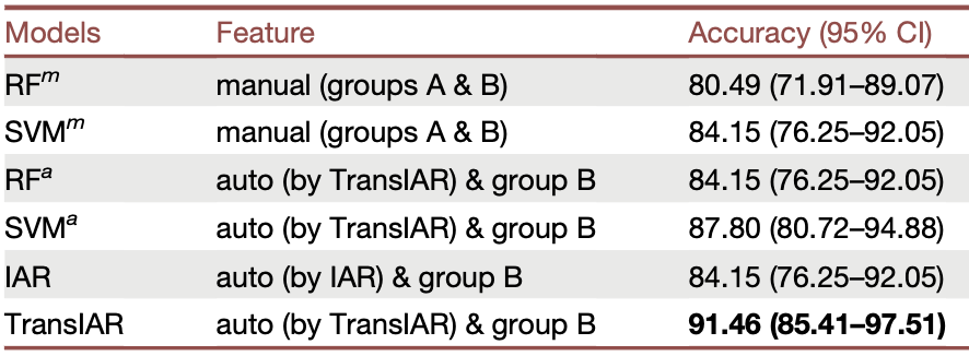 为了检验模型的泛化性能,这项研究收集了其他四家医院共43例样本作为外部测试集,结果如表4所示,TransIAR达到了93.02%的准确率,表明其具有强大的泛化性能,该表也体现了传统机器学习方法泛化性较差的缺陷。