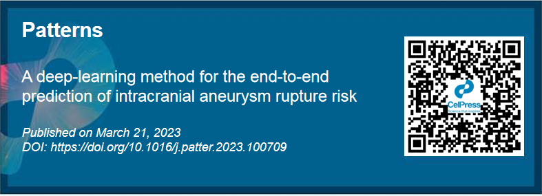 2023年3月21日,上海交通大学电子信息与电气工程学院计算机系、认知机器与计算健康研究中心徐雷教授和涂仕奎副教授课题组,联合温州医科大学附属第一医院放射科杨运俊主任团队在Cell Press细胞出版社旗下期刊Patterns上发表了一篇题为“A deep-learning method for the end-to-end prediction of intracranial aneurysm rupture risk”的研究(博士生李培莹、硕士生刘永昌、周甲丰医生为共同第一作者)。为了能更高效精准地评估颅内动脉瘤的破裂风险从而促进临床医生对动脉瘤患者的精细化管理,降低患者的死亡率,他们提出了第一个端到端的破裂风险预测深度学习模型TransIAR。该模型能从3D-CTA图像数据中自动提取形态学特征用于构建模型来准确预测颅内动脉瘤是否发生破裂;并且该模型的效能显著优于基于人工特征的传统机器学习方法。另外,在临床实验中,TransIAR相比于医生通过手动测量获得的形态学参数构建的预测模型具有更高的准确率和更快的预测速度,进一步表明该模型具有潜在的临床应用前景。