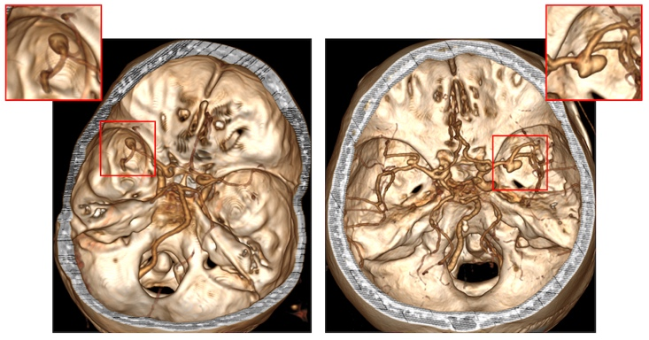 颅内动脉瘤是由于异常血流的长期影响而在颅内血管壁薄弱区域形成的病理性扩张,如图1所示。颅内动脉瘤在人群中的患病率约为3.2%,大部分的动脉瘤相对稳定,其破裂概率在0.25%到0.50%之间。但是一旦动脉瘤发生破裂,患者的死亡率超过50%。随着无创影像技术的不断发展,颅内未破裂动脉瘤的检出率不断增高。为了避免动脉瘤破裂带来的灾难性后果,可以通过线圈栓塞等手术进行预防性治疗;但是手术治疗也会引起一系列的并发症,从而导致患者死亡。这种矛盾的情况促使我们需要一个工具能精准预测出动脉瘤的破裂风险,辨别出可以保守治疗的低风险动脉瘤和需要手术干预的高风险动脉瘤,以降低动脉瘤患者的死亡率。