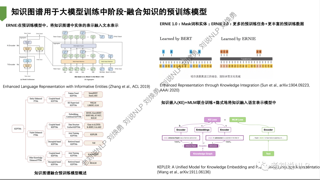 将知识图谱隐式地加入到模型训练中,ERNIE在预训练模型中将知识图谱中实体的表示融入文本表示;知识嵌入(KE)+MLM联合训练+隐式地将知识融入语言表示模型中;