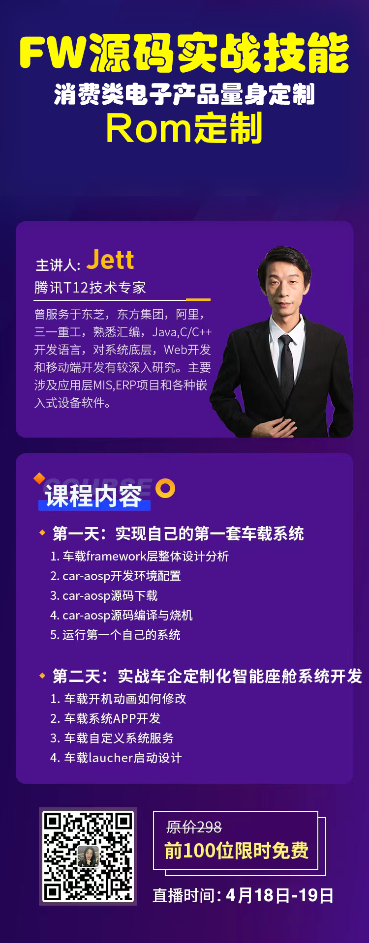 我们特邀了互联网大佬 Jett老师,为大家分享前两节直播课《FW源码实战技能-消费类电子产品量身定制ROM系统》,让大家了解智慧座舱中 Framework层设计原理和源码实战。