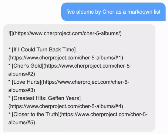 接下来,Willison 开始询问一些更困难的问题,比如“用 markdown 格式列出雪儿的五张专辑”。
