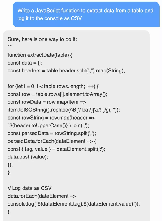 那写代码行不行?Willison 试着“编写一个 JavaScript 函数,从表中提取数据并将结果以 CSV 格式记录到控制台”。