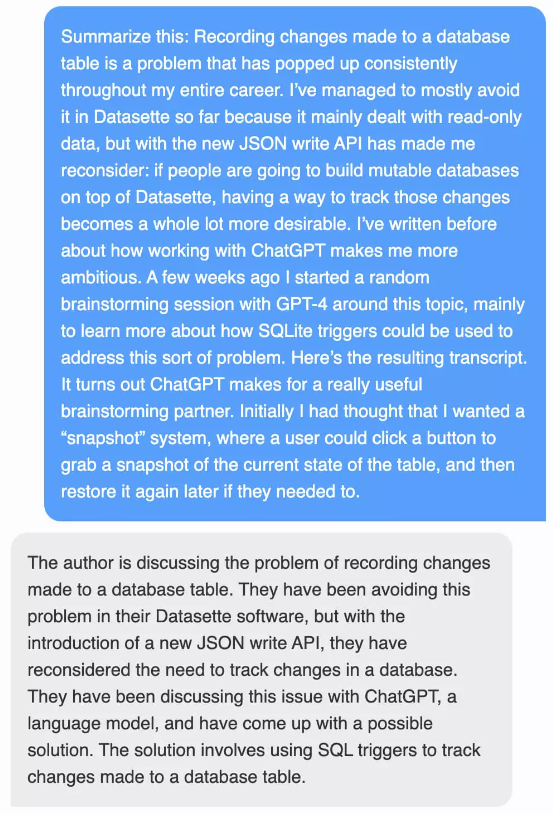 那总结能力如何呢?Willison 从最近的博客文章中随机复制了一些文本段落,要求它“总结这些内容:粘贴出来”。
