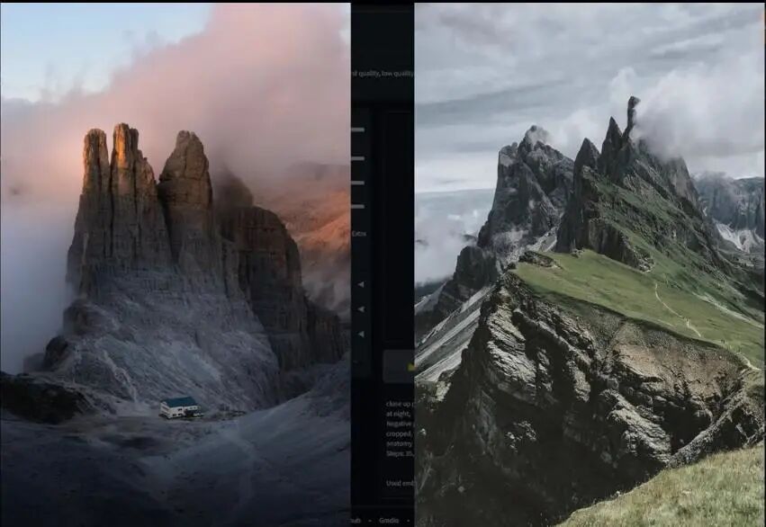 这里我们将指令中的角色相关内容去掉,将强度改回1,种子改为随机(-1),我们可以先测试一个户外环境的生成,比如意大利北部的名山多洛米蒂山(Dolomites),然后看它是否能够生成与其相关联的图形。