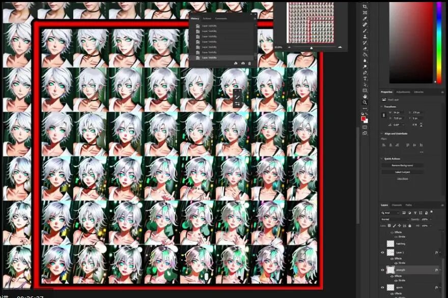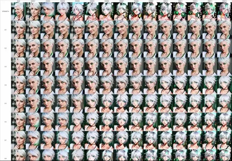 这是Photoshop里的视图,横轴是X,竖轴是Y,这时候我们可以选择应该进一步测试哪个回合了。有人建议,LoRA强度为1的时候不应该有过度拟合。幸运或者不幸的是,由于尝试了很多次,我们并没有得到特别糟糕的结果。