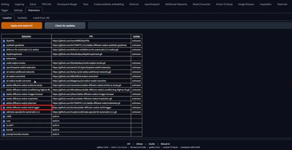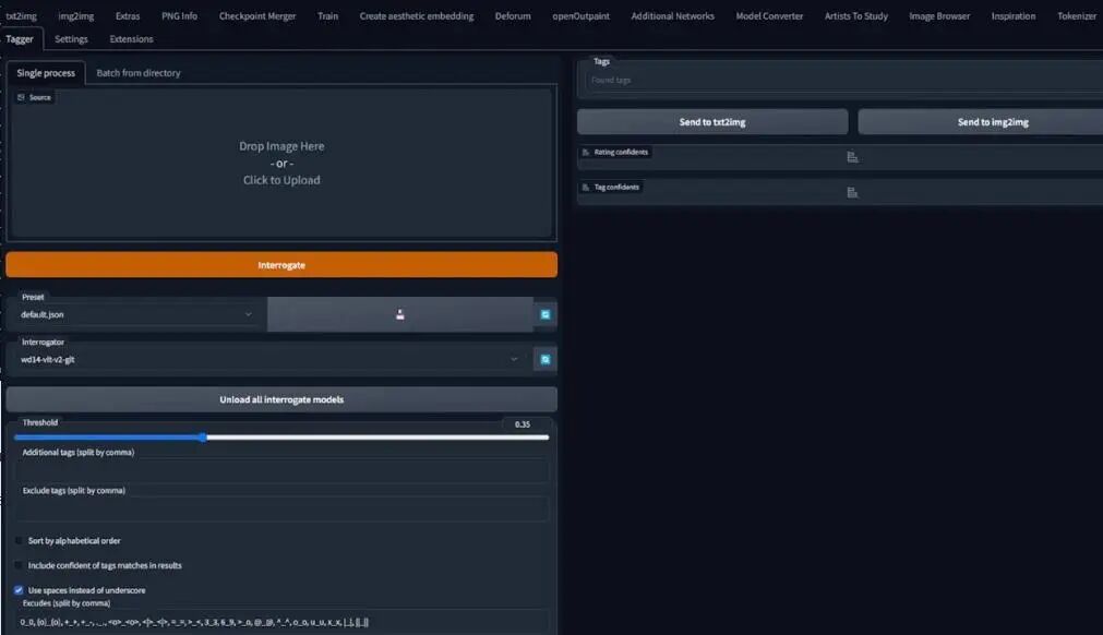 由于这里假设你不会使用Kohya本地安装,而是使用Google Colab,所以我这里改变了添加说明文字的流程来使用AUTOMATIC1111里的网页扩展tagger。