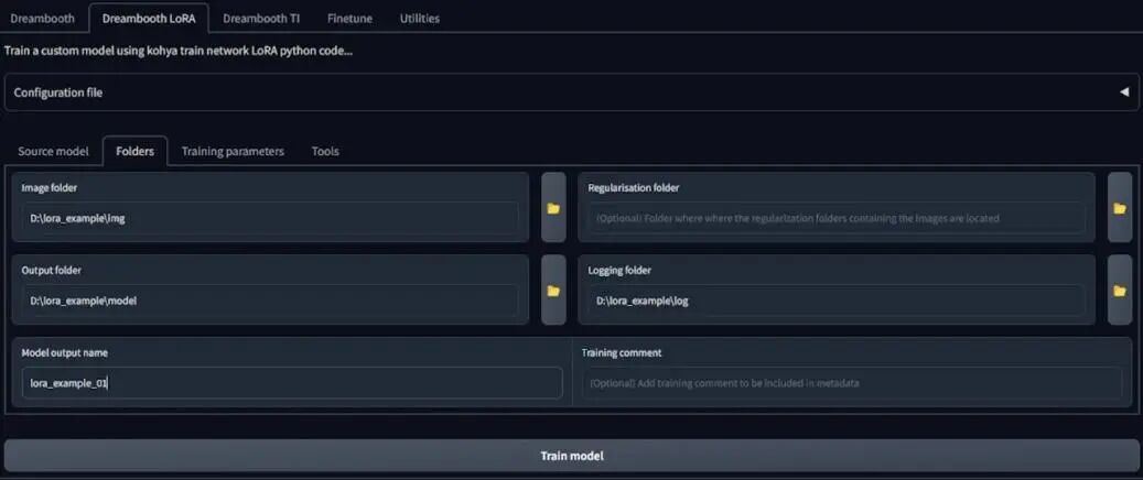 然后我们来到文件夹(Folders)标签,我们不用手动输入文件夹路径,它是上一步已经设置好的。对于模型输出名字,我这里设置为lora_example_01。