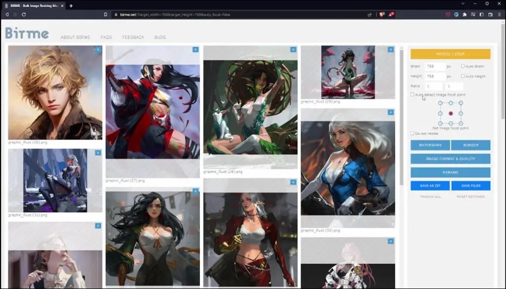 下一步,将这些图片放到图片处理工具中,我这里使用了birme,我发现自己的电脑配置可以支持768×768尺寸的图片训练,所以我将图片裁剪成这个分辨率尺寸。
