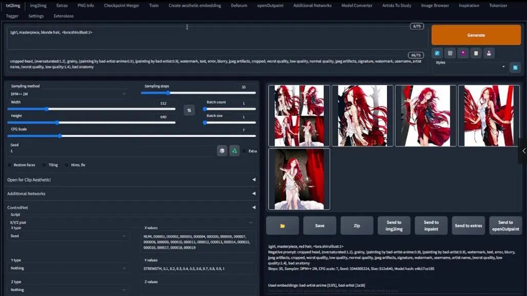接下来,我在脚本选项下打开XYZ选择,还记得回合数是以LoRA名字格式保存的,所以这里使illust_12,随后是五个0,然后是一个整数,LoRA的权重或强度在冒号之后。我想要一个不仅能展示回合模型的变种,还能改变LoRA权重的网格。