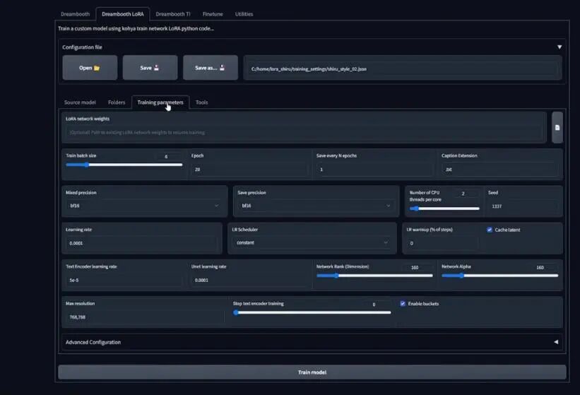 接下来是训练参数设置,打开Training Parameters之后看到的是默认设置,然而,由于我的数据集训练了157张图片,这些默认设置表现不会很好。经过了多次尝试之后,我发现使用修改后的设置配置文件好很多,所以我将它们加载到训练参数里。